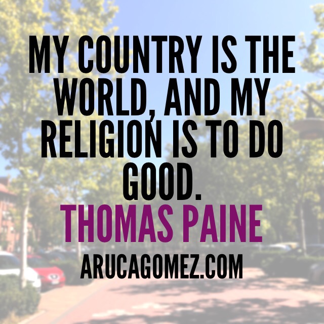 Reflexión del día/Daily dose Publicado el septiembre 22, 2017 por arucagomez “Mi país es el mundo y mi religión es hacer el bien” Thomas Paine ¿Y los tuyos? 😉 Help someone else! Share this:Compartir en TumblrPocketMás Haz clic para enviar un enlace por correo electrónico a un amigo (Se abre en una ventana nueva) Correo electrónico Haz clic para imprimir (Se abre en una ventana nueva) Imprimir Tweet Haz clic para compartir en Telegram (Se abre en una ventana nueva) Telegram Haz clic para compartir en WhatsApp (Se abre en una ventana nueva) WhatsApp EntradaMe gusta Cargando...