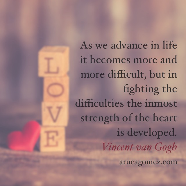 Inspiración del lunes : fuerza / Monday inspiration: strength Publicado el marzo 23, 2020 por arucagomez Así como vamos adentrándonos en la vida se hace cada vez más difícil pero venciendo las dificultades que nos encontramos la fuerza interior de nuestro corazón se hace más grande.Vincent Van Gogh¡A por ellas!¡Con corazón! ❤️ Help someone else! Share this:Compartir en TumblrPocketMás Haz clic para enviar un enlace por correo electrónico a un amigo (Se abre en una ventana nueva) Correo electrónico Haz clic para imprimir (Se abre en una ventana nueva) Imprimir Tweet Haz clic para compartir en Telegram (Se abre en una ventana nueva) Telegram Haz clic para compartir en WhatsApp (Se abre en una ventana nueva) WhatsApp EntradaMe gusta Cargando...