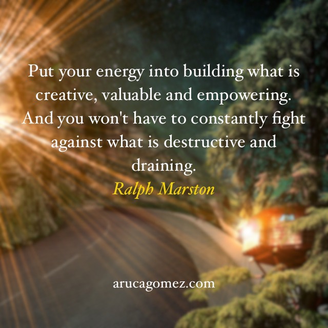 Inspiración del lunes: energía/ Monday inspiration: energy Publicado el junio 22, 2020 por arucagomez Pon tu energía en construir algo que sea creativo, valioso y que te fortalezca así no tendrás que luchar constantemente contra lo queens destructivo y agotador.Ralph Marston¿En qué vas a poner tu energía este lunes único? Help someone else! Share this:Compartir en TumblrPocketMás Haz clic para enviar un enlace por correo electrónico a un amigo (Se abre en una ventana nueva) Correo electrónico Haz clic para imprimir (Se abre en una ventana nueva) Imprimir Tweet Haz clic para compartir en Telegram (Se abre en una ventana nueva) Telegram Haz clic para compartir en WhatsApp (Se abre en una ventana nueva) WhatsApp EntradaMe gusta Cargando...