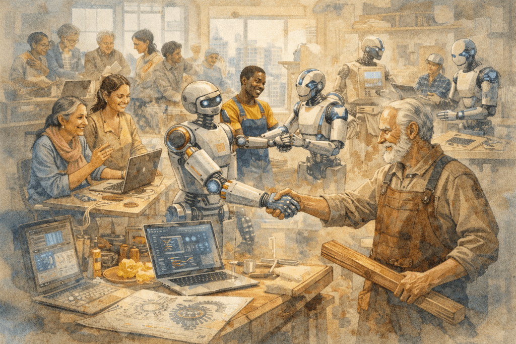 Pronto el taller cambió. Los robots levantaban estructuras imposibles de hacer antes. Los artesanos diseñaban cosas nuevas. Los jóvenes imaginaban soluciones que antes parecían ciencia ficción.