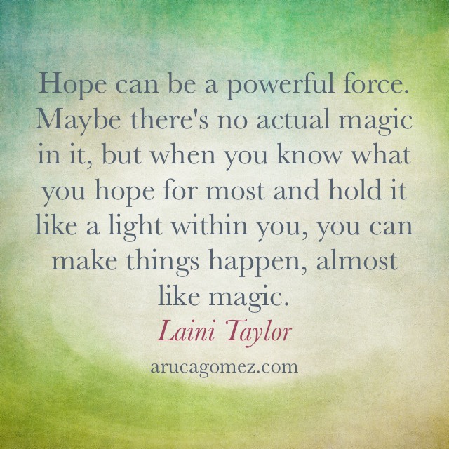 La esperanza puede ser una fuerza poderosa. Quizá no sea mágica pero cuando tienes esperanza y la mantienes encendida dentro de ti , puedes hacer que las cosas ocurran casi mágicamente. Laini Taylor ¿Tienes esperanza? ¿Para qué la puedes utilizar en esta situación? ¿Eres capaz de hacer magia? ¿Y de ser mágico? 😉