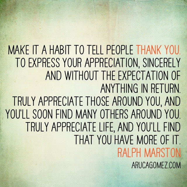 Haz que dar las gracias sea un hábito en ti. Expresa tu aprecio sincero sin esperar nada a cambio. Aprecia de verdad a los que te rodean y pronto lo harán muchos más. Aprecia de verdad la vida y siempre encontrarás más de lo que esperas.
