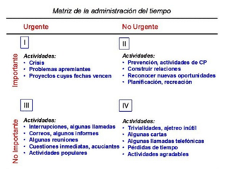 En ella, los factores que definen las tareas son urgente e importante, ante lo urgente reaccionamos, cuadrante I, este agota y consume a muchas personas, este cuadrante crece hasta que domina. Las que son urgentes pero no importantes, son prioridades y/o expectativas de otros, en caso de que nos dediquemos principalmente al cuadrante III o en el IV , la vida que llevaremos será irresponsable.Las personas efectivas, que llevan a cabo tareas que requieren proactividad, es decir, hacen que las cosas ocurran, se sitúan fuera del III y IV, reducen el I y se sitúan en el II